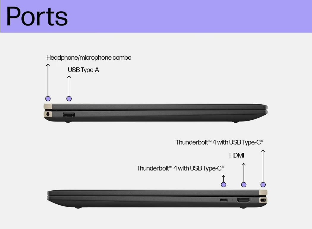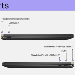 1 USB Type-A 10Gbps signaling rate (HP Sleep and Charge); 1 HDMI-out 2.1; 1 headphone/microphone combo; 2 Thunderbolt™ 4 with USB Type-C® 40Gbps signaling rate (USB Power Delivery, DisplayPort™ 2.1, HP Sleep and Charge)